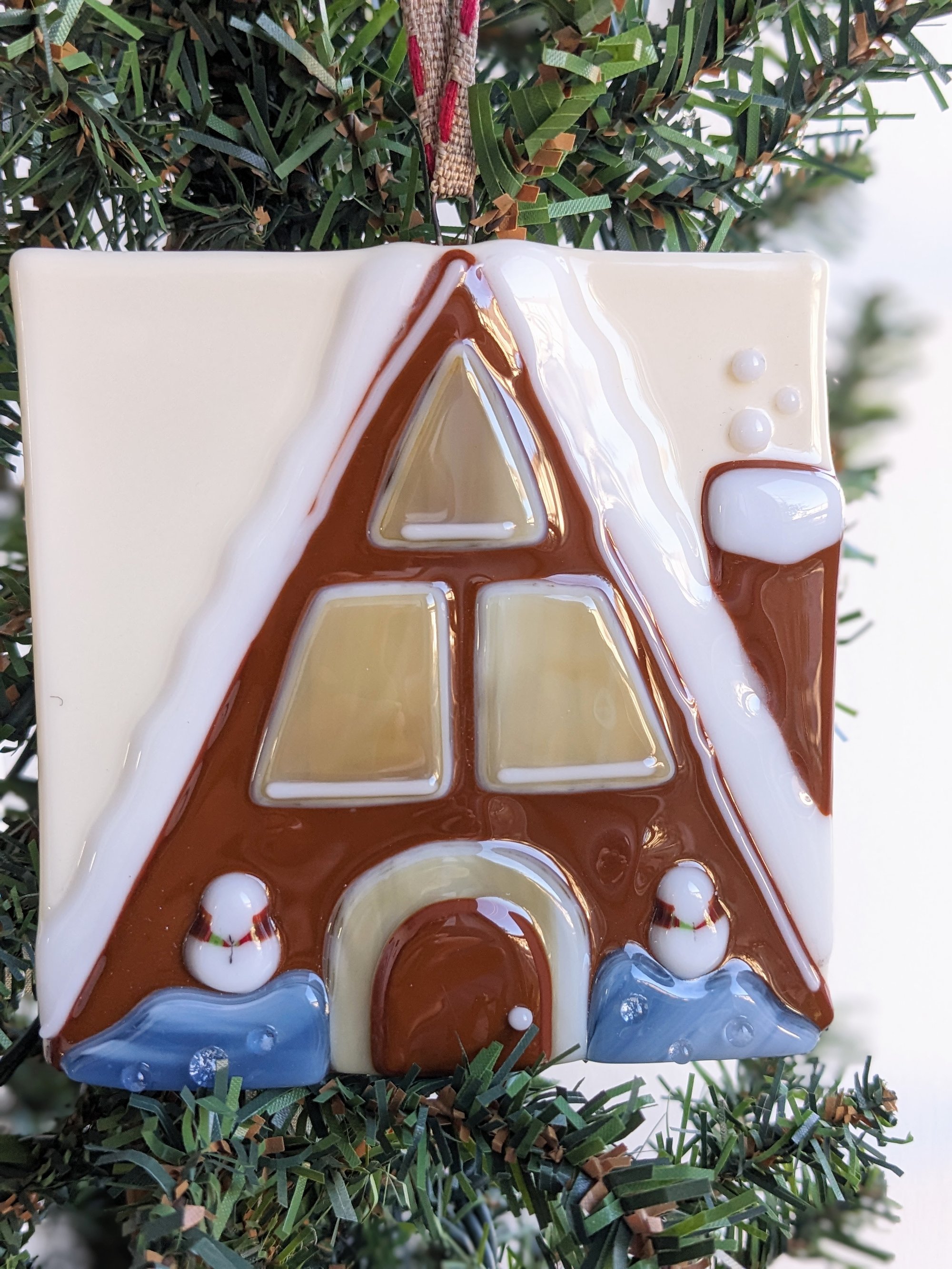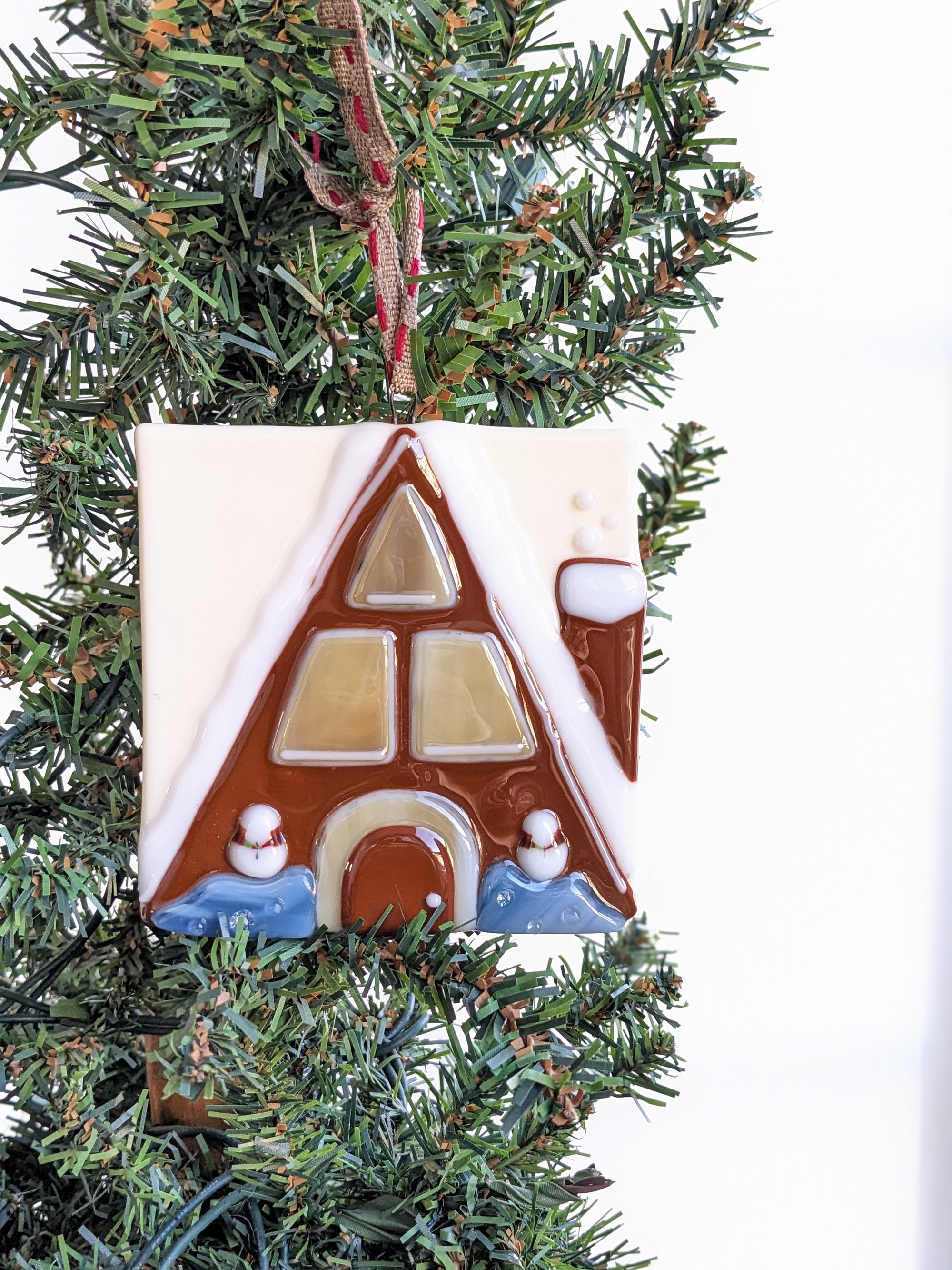 A-Frame Gingerbread Cabin Fused Glass Ornament