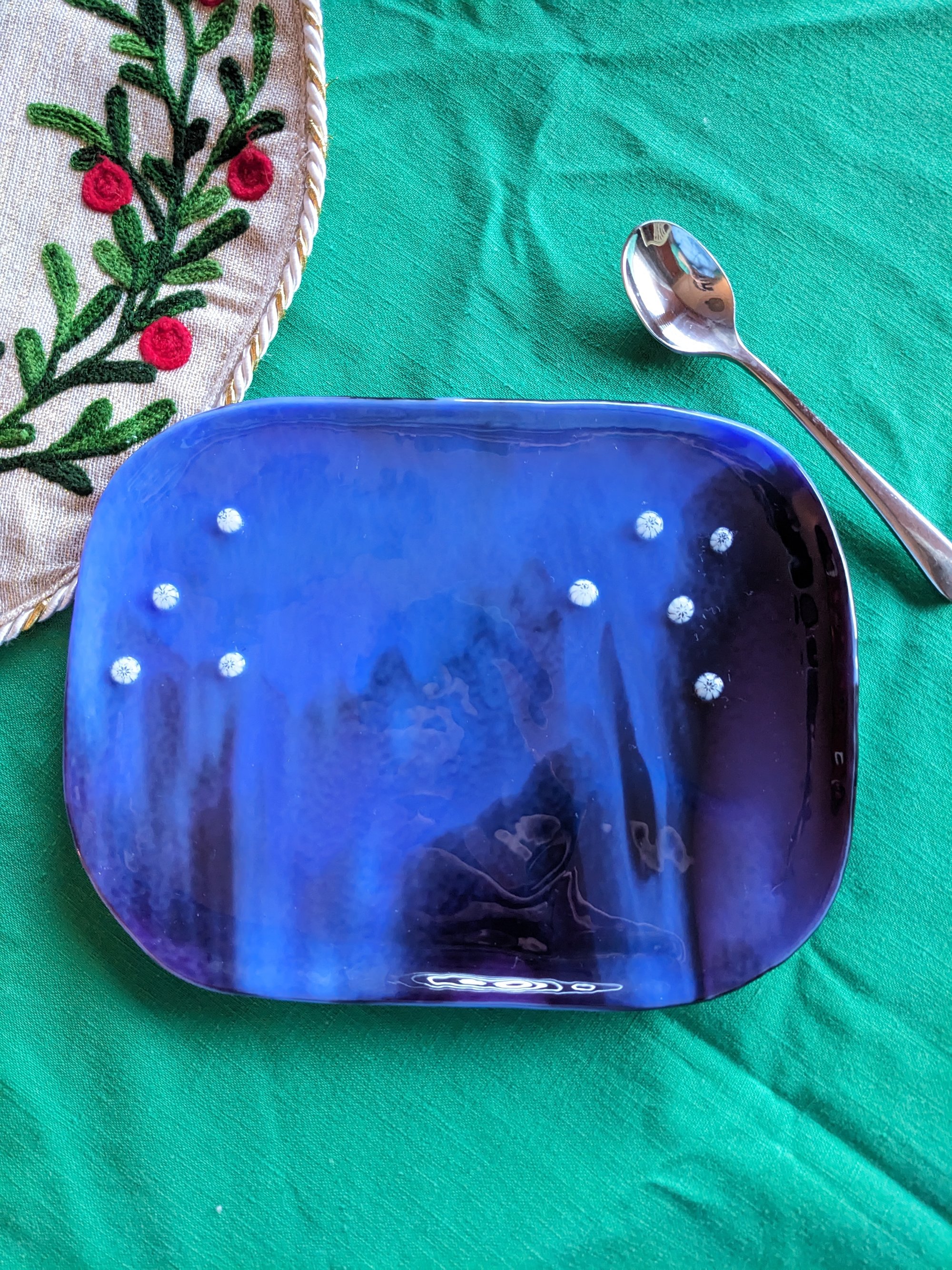 Made with opaque deep blue and black fusing glass and snowflakes, the serving plate was created by slowly fusing the glass nearly 1,500 degrees into one layer. Once fused, the piece was then fired a second time into a slumping mold to form the plate.
