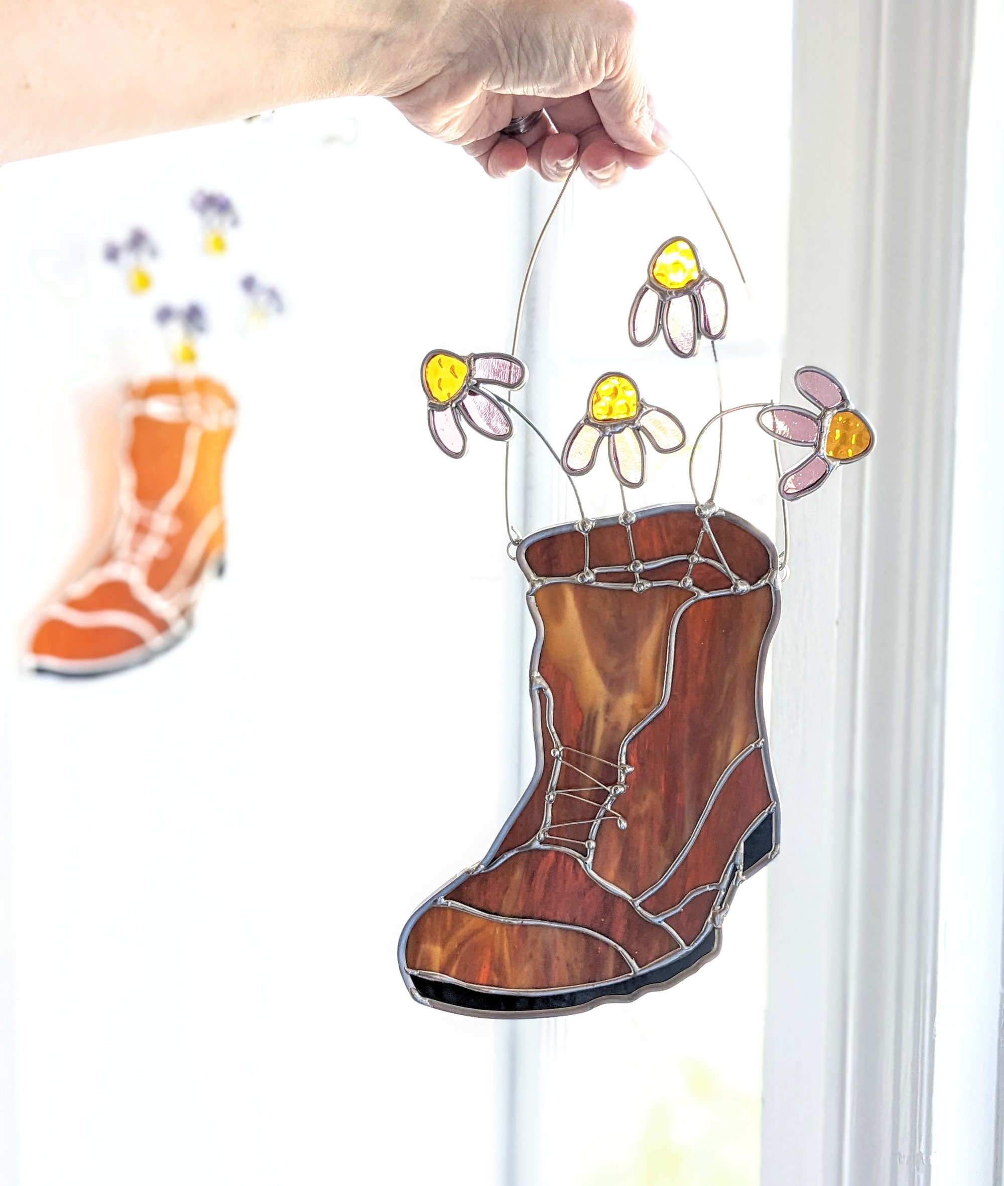 Stained glass and hiking in the woods come together in this earthy, handcrafted window hanging. The boot is made with swirled brown and ochre glass to create a well-worn and loved old leather boot and is paired with 3D coneflowers made with pink and yellow water glass.