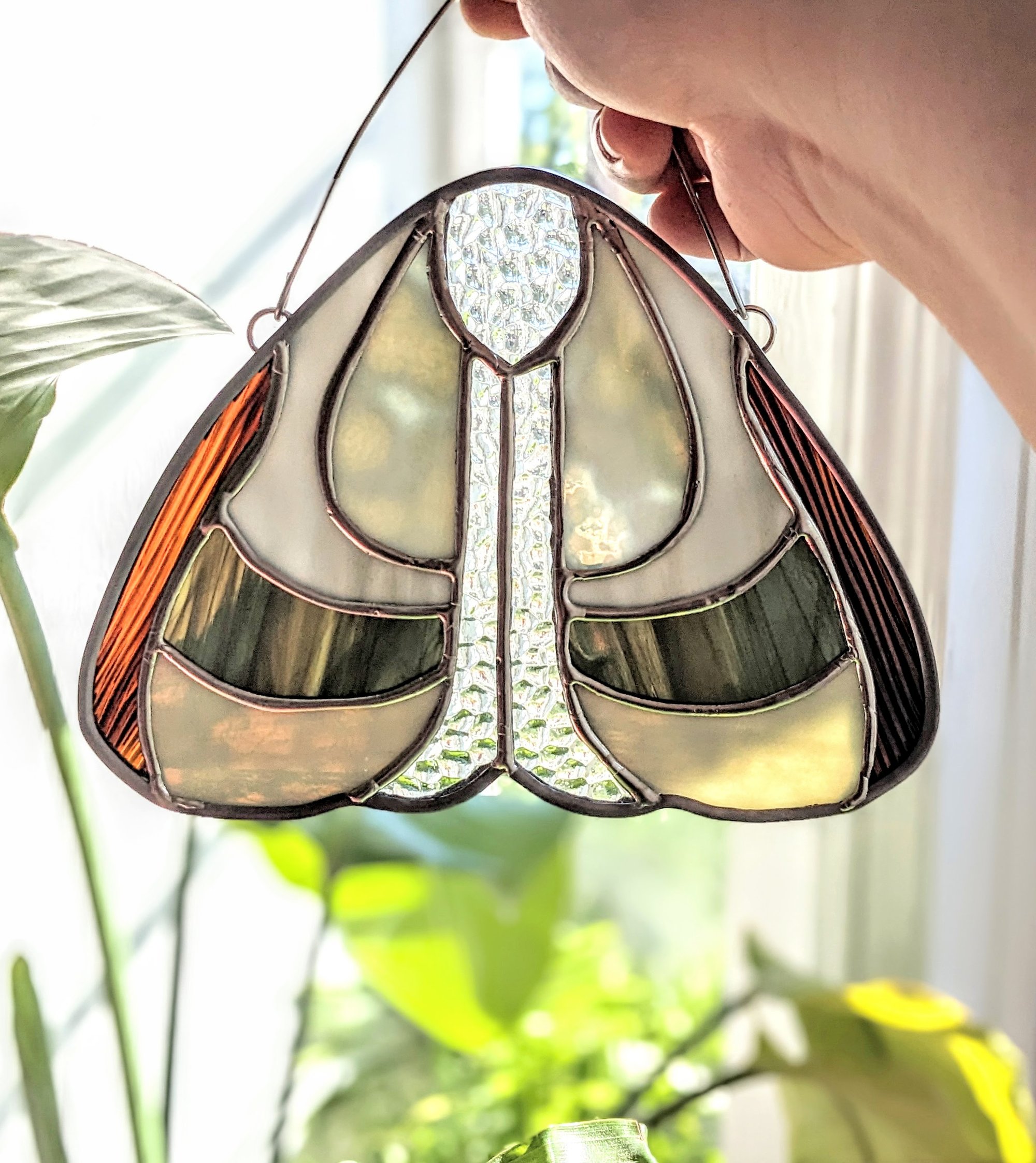 The Forest Moth is made using the Tiffany-method of copper foil and solder. I selected various colors of Pennsylvania-based Youghiogheny glass, which is hand crafted to capture the essence of nature, as well as streaky glass and textured cathedral glasses to create a soft woodland feel.