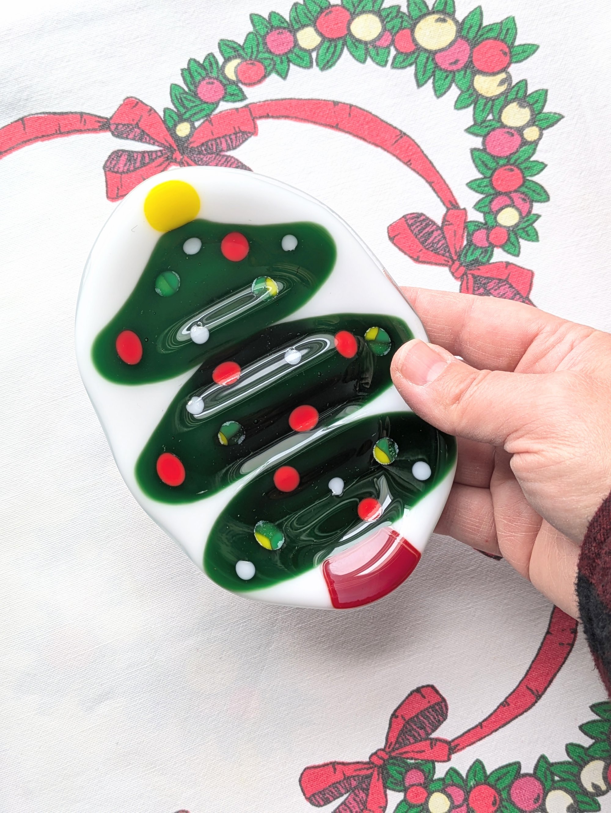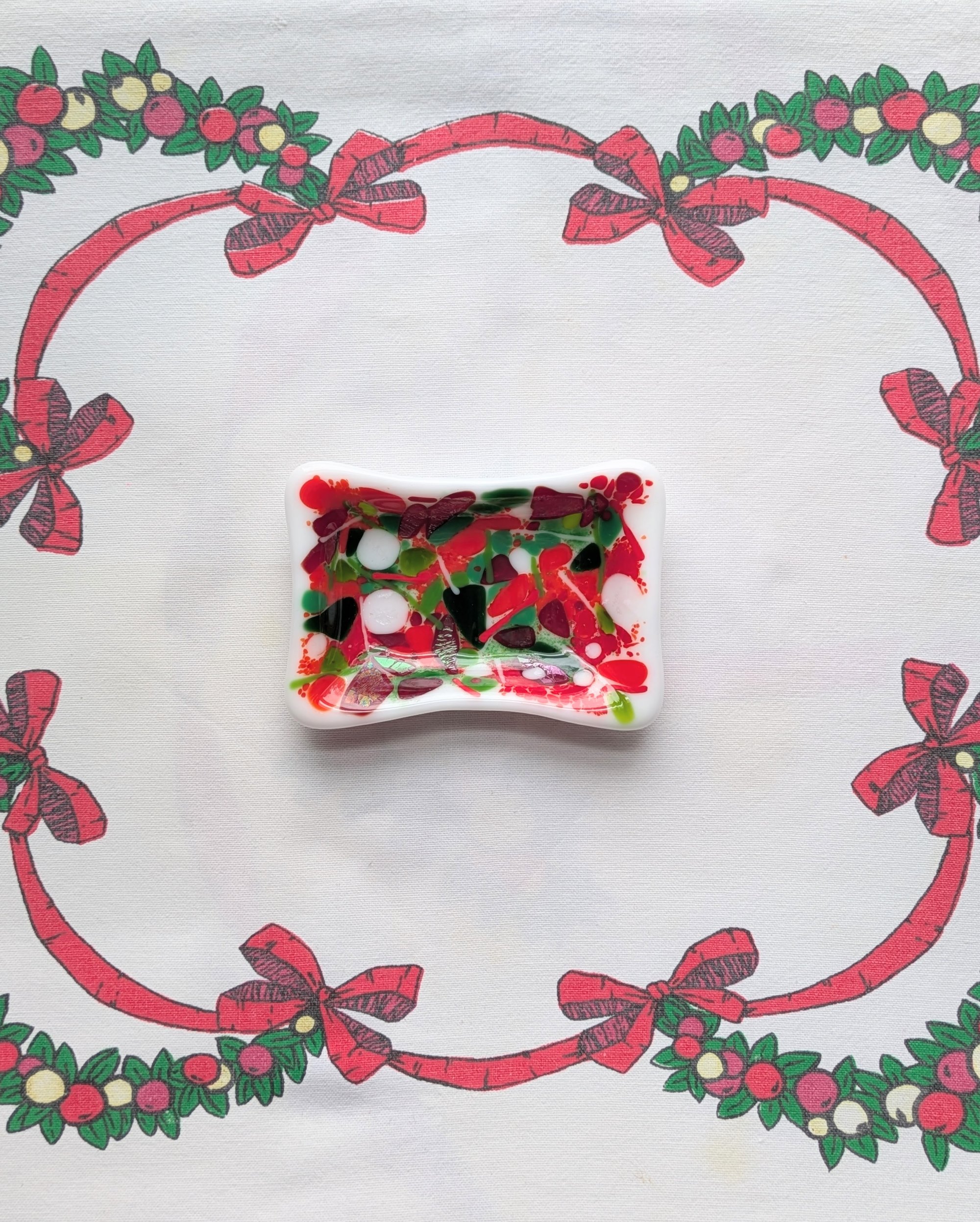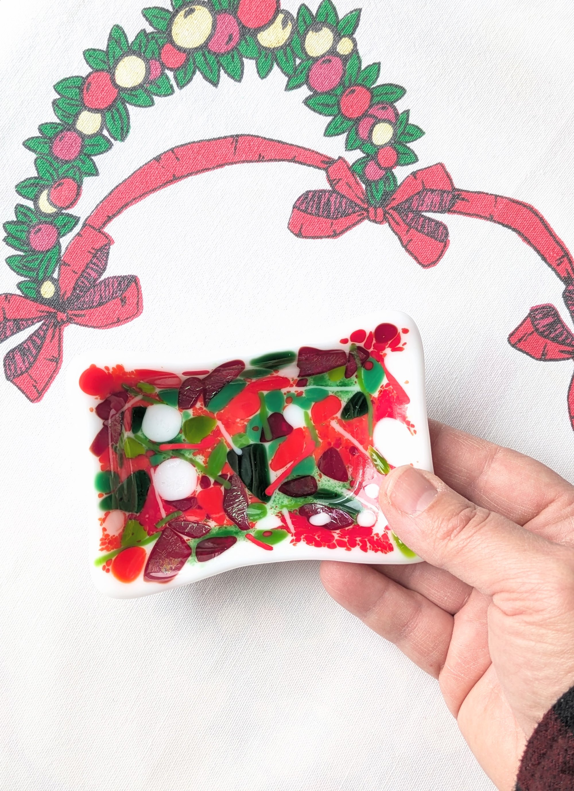 Each soap or trinket dish was made by scoring/breaking individual pieces of fusing glass, layering them together and firing them at 1,500 degrees for 12 hours in my kiln.