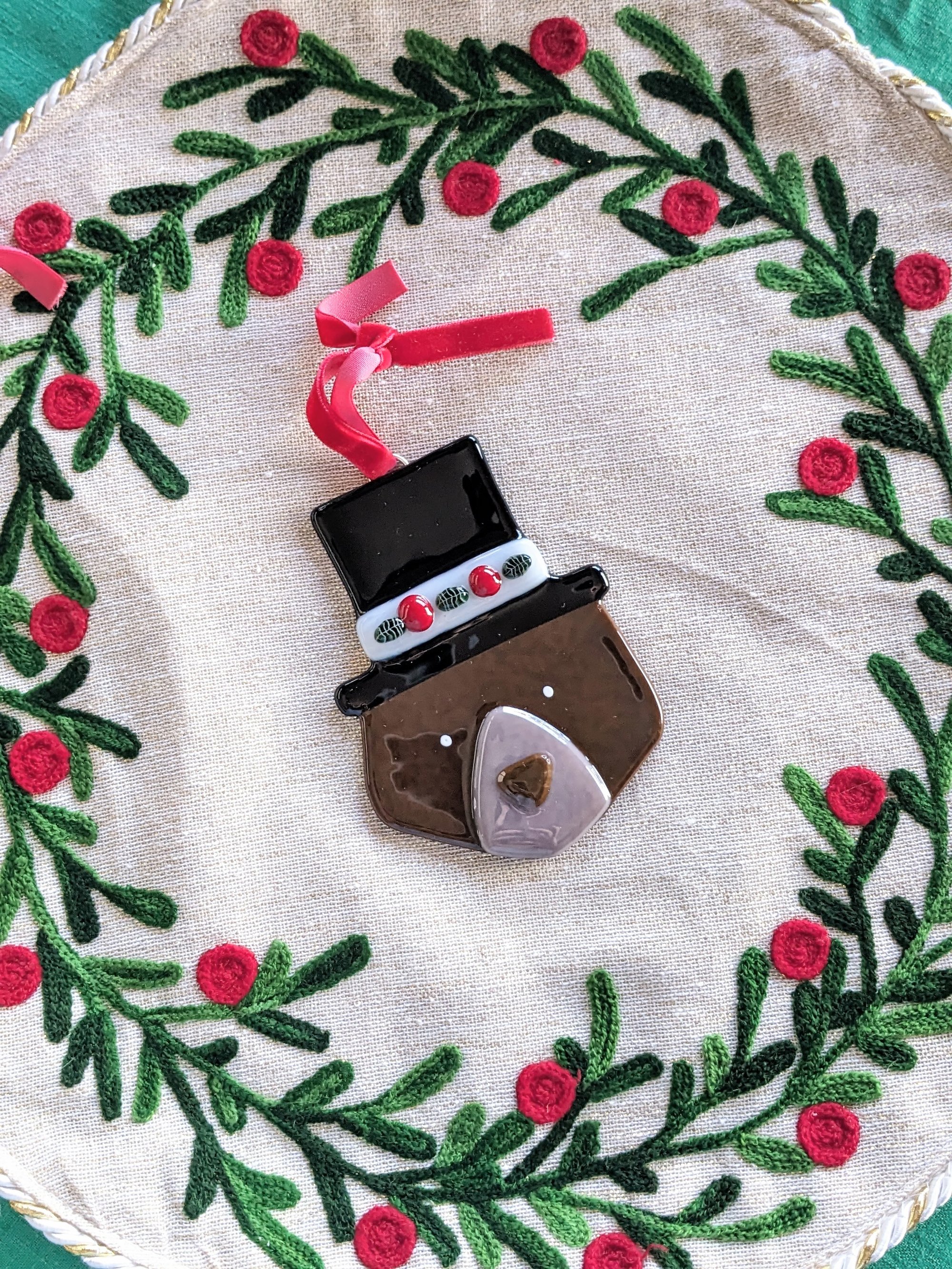 An annual favorite of my Woodland Critters Ornaments Collection: Holly Bear-y Fused Glass Ornament. A simpler version of my botanical bugs bear, this dashing top hat bear is decked out in Dickinson-style and ready for caroling.
