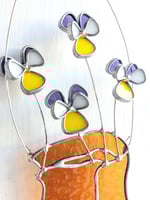 The boot is made with amber English muffle, a classic textured glass that has been made for England's churches since the early 1900's. The 3D Johnny Jump Up flowers are my original design and made with water glass that glow bright in the sun.