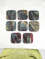 I have one set of these coasters in stock! The images shown are examples. I'm happy to send you pictures of the exact coasters or let you be surprised. The beauty of this glass is that each firing is different so each coaster is completely unique.
