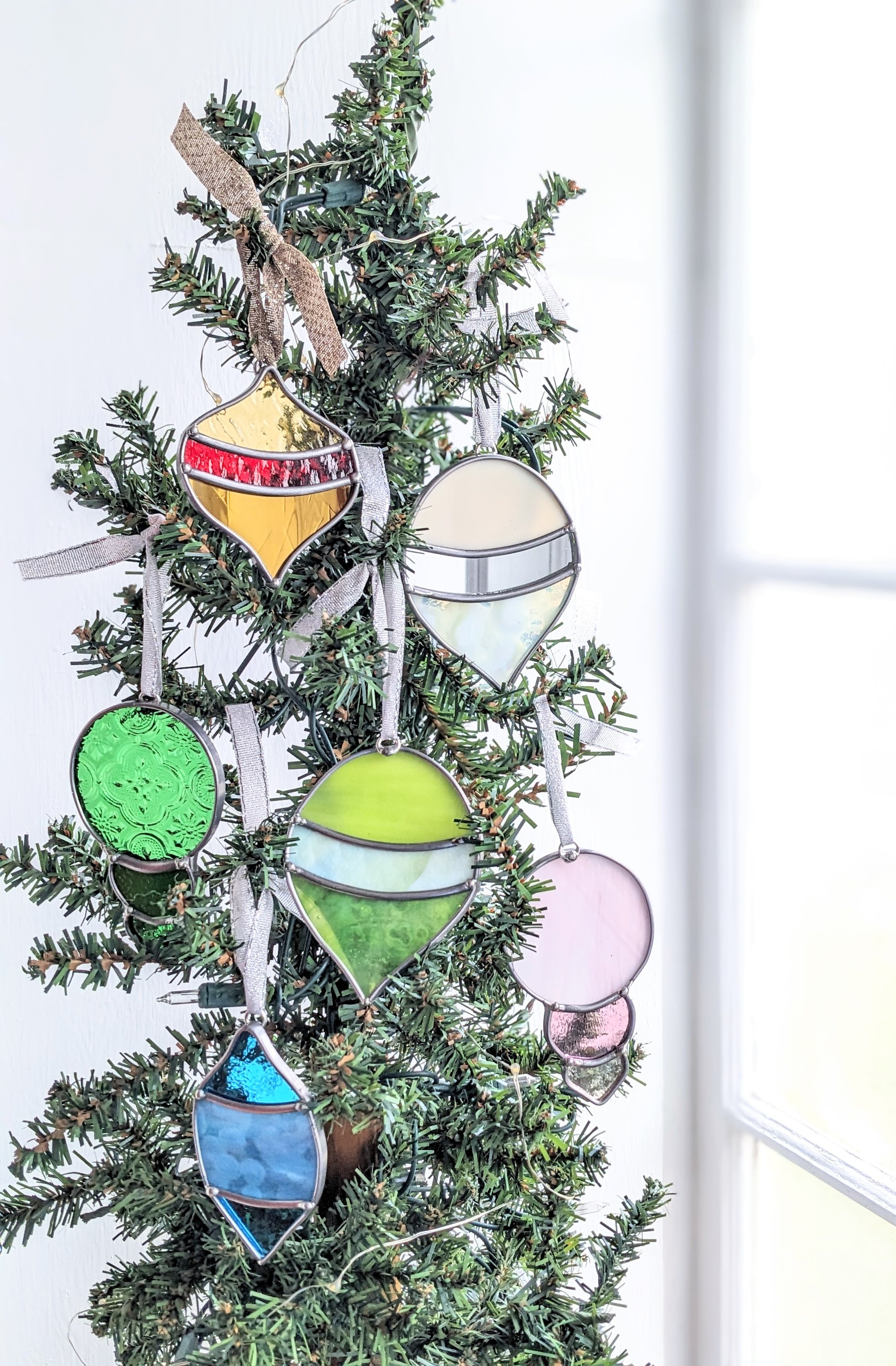 One of Leigh's original, handcrafted designs, hand cut and completed in my glass studio. Glass is a unique material in that these elegant colors will stay rich forever in the sun or when stored for annual home decor. Made in Tiffany-fashion.