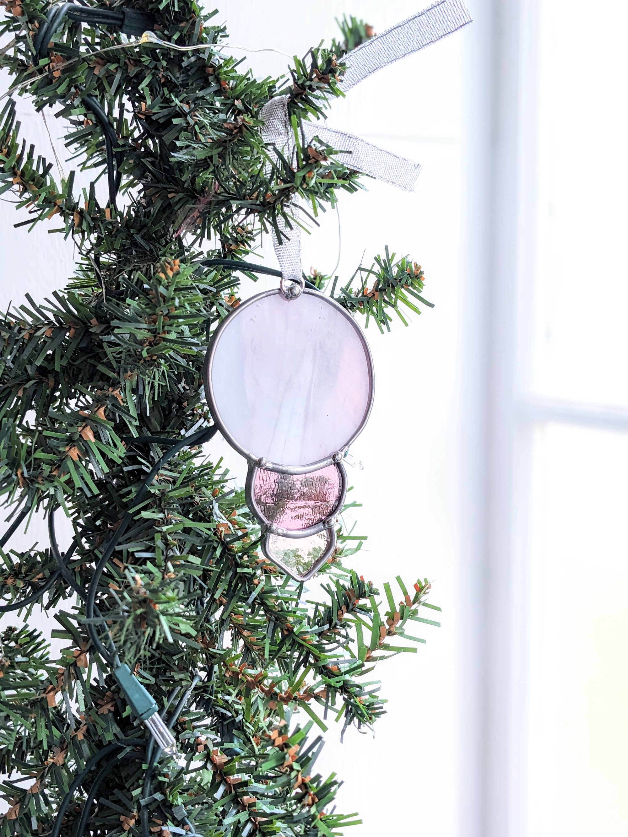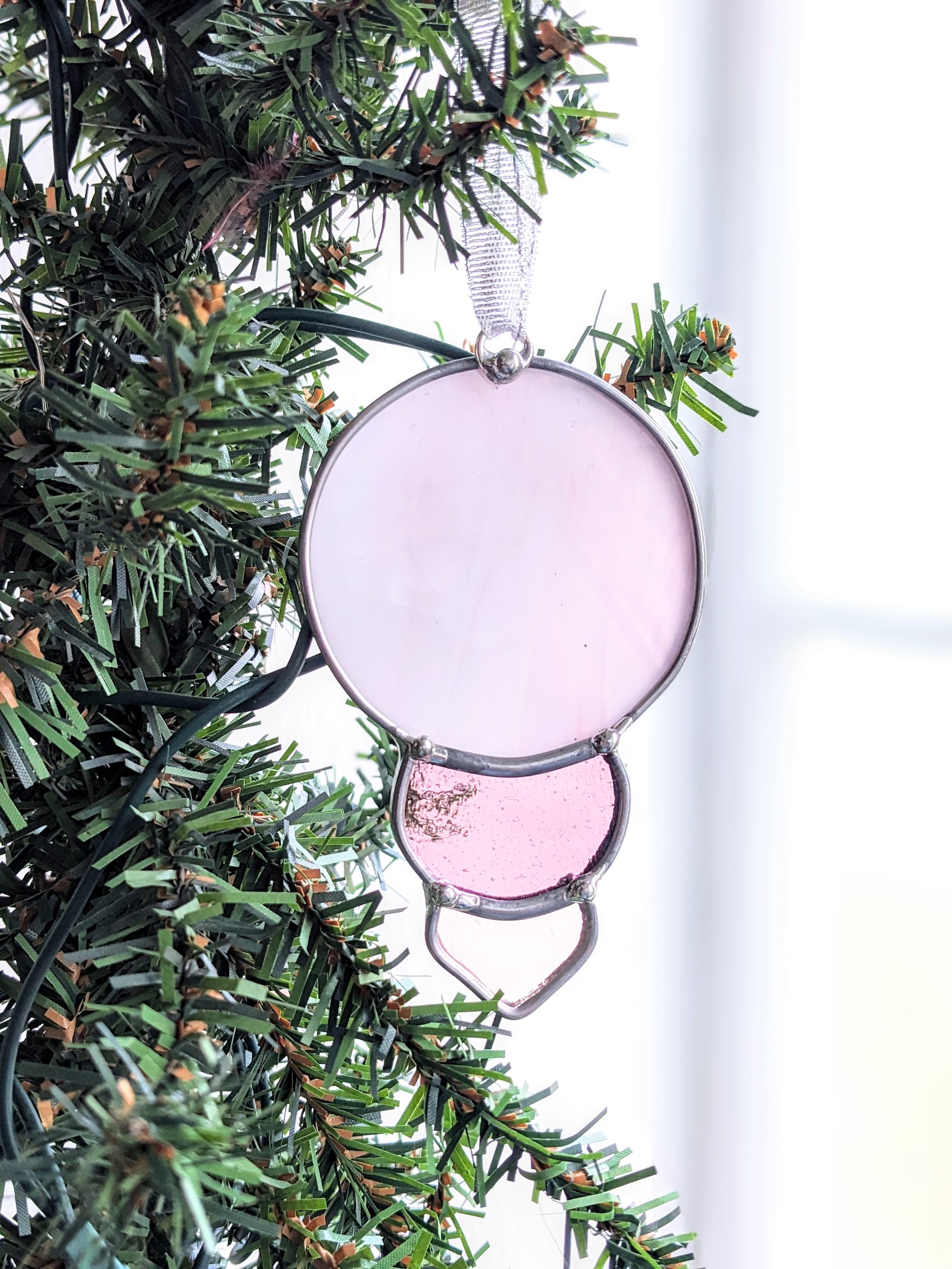 Designed and created by Leigh, my wonderful spouse, this ornament is made with semi-opaque pink glass and pink water glass in Art Deco style.