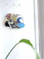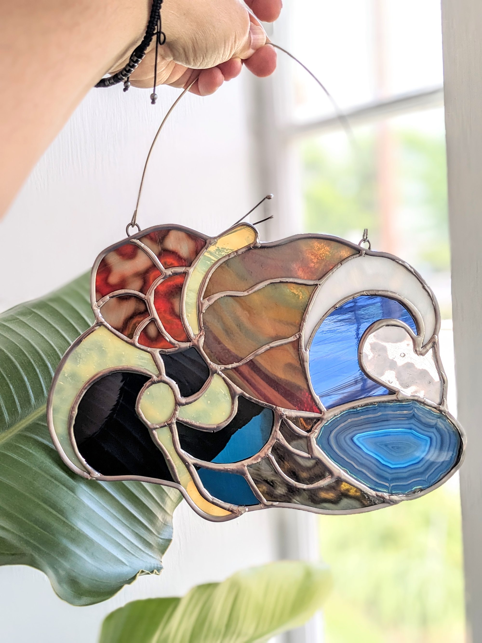 Materials: Blue agate, stained glass, copper foil, lead frame, lead solder, metal hook and hanging wire.